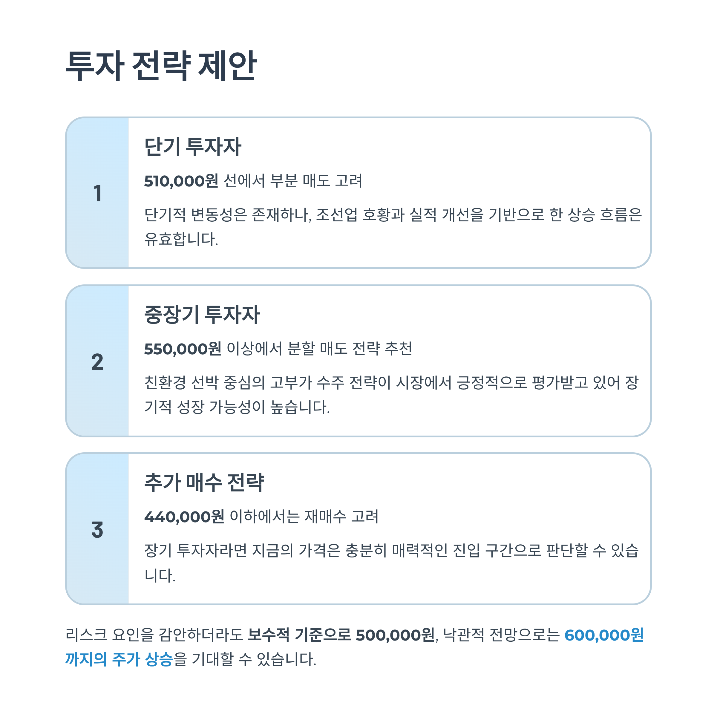 - 중장기 투자자: 550,000원 이상에서 분할 매도 전략 추천