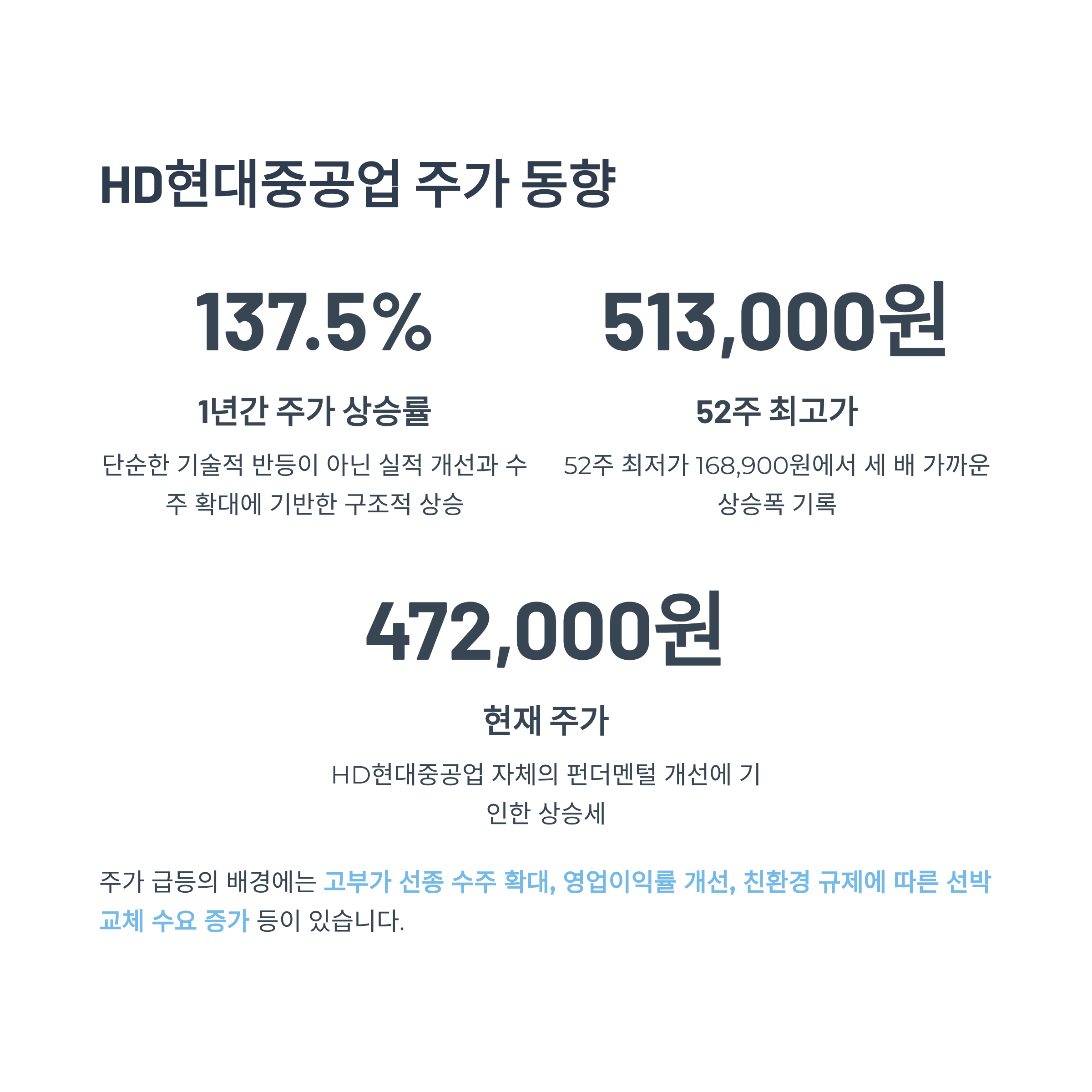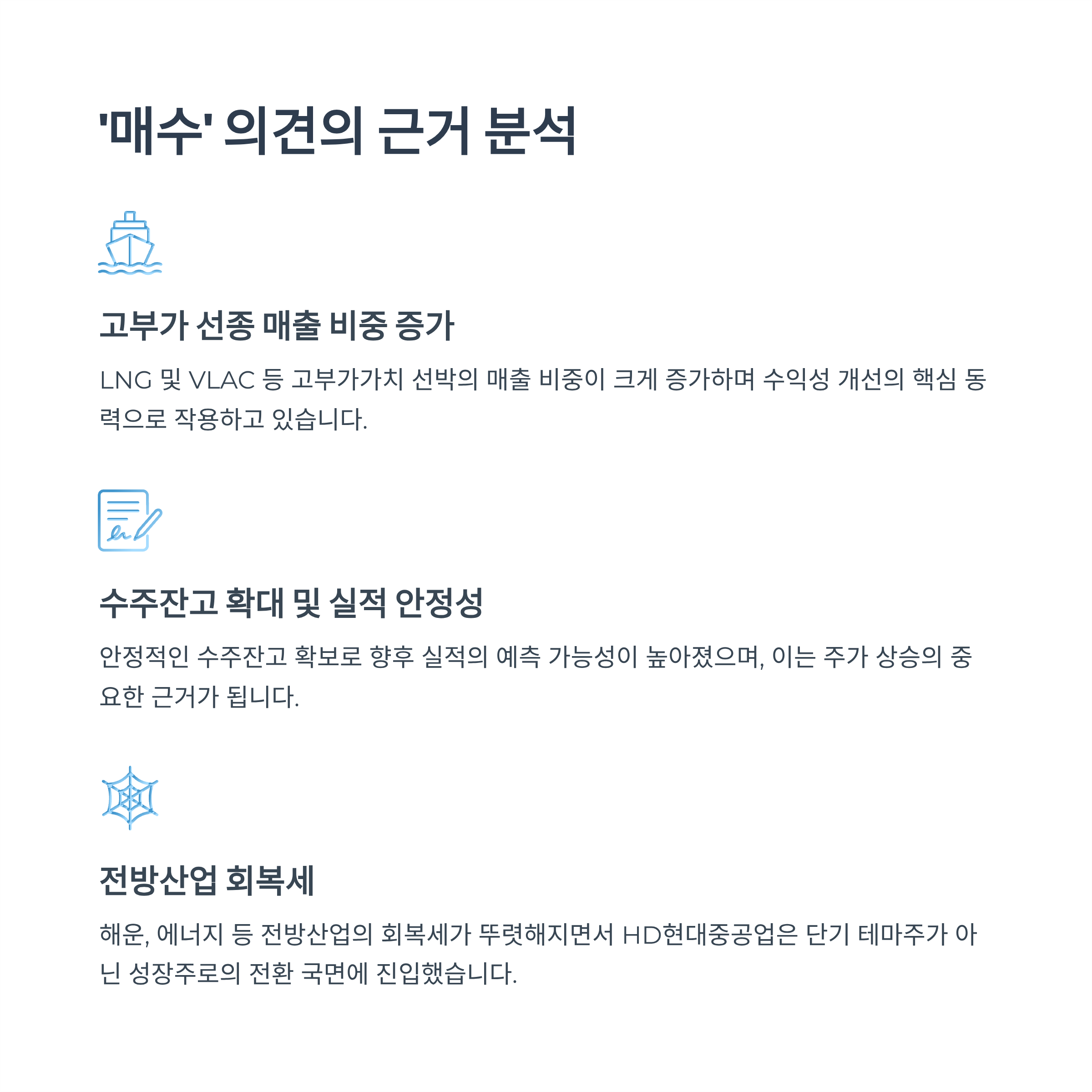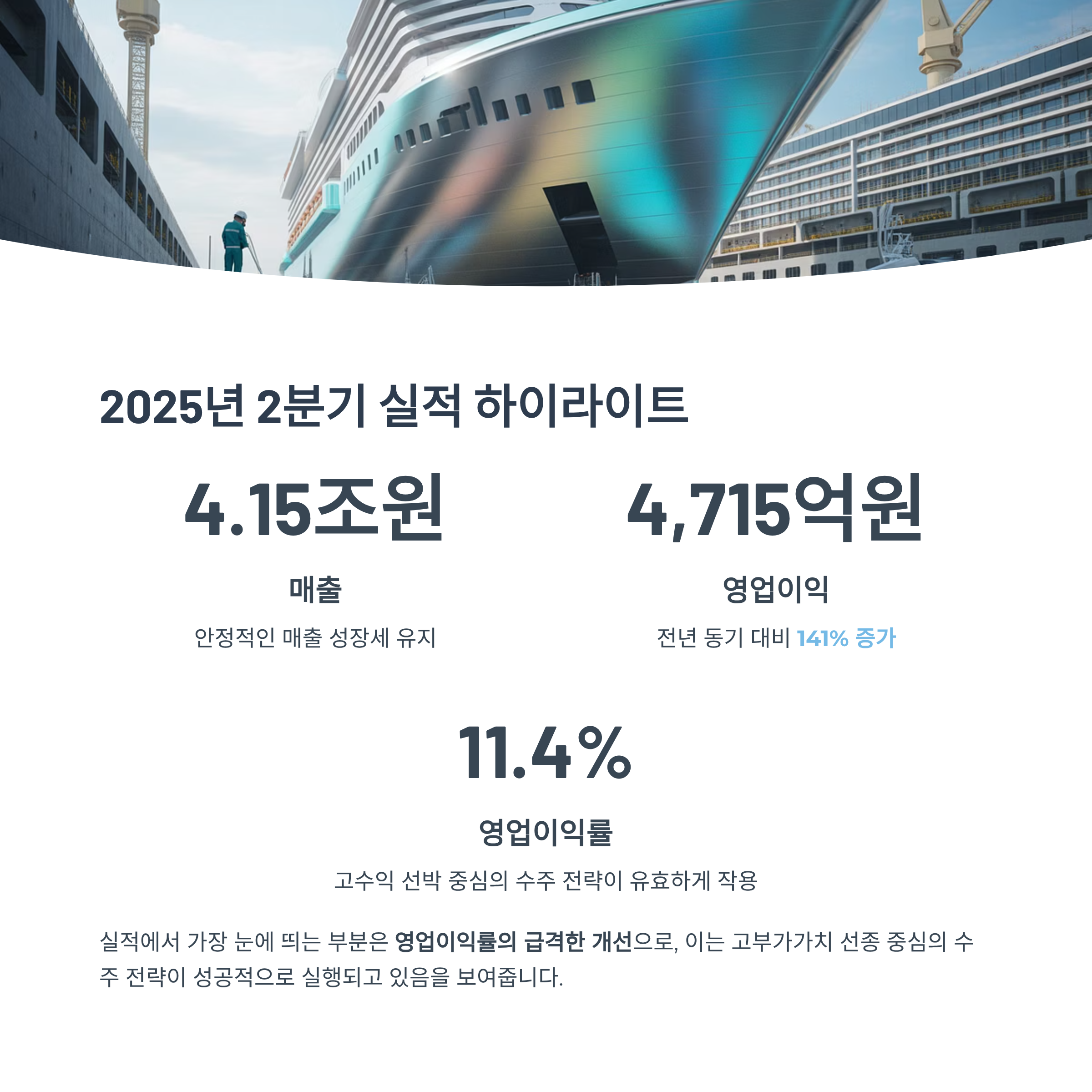 - 특히, 친환경 선박 중심의 고부가 수주 전략이 시장에서 긍정적으로 평가받고 있습니다.