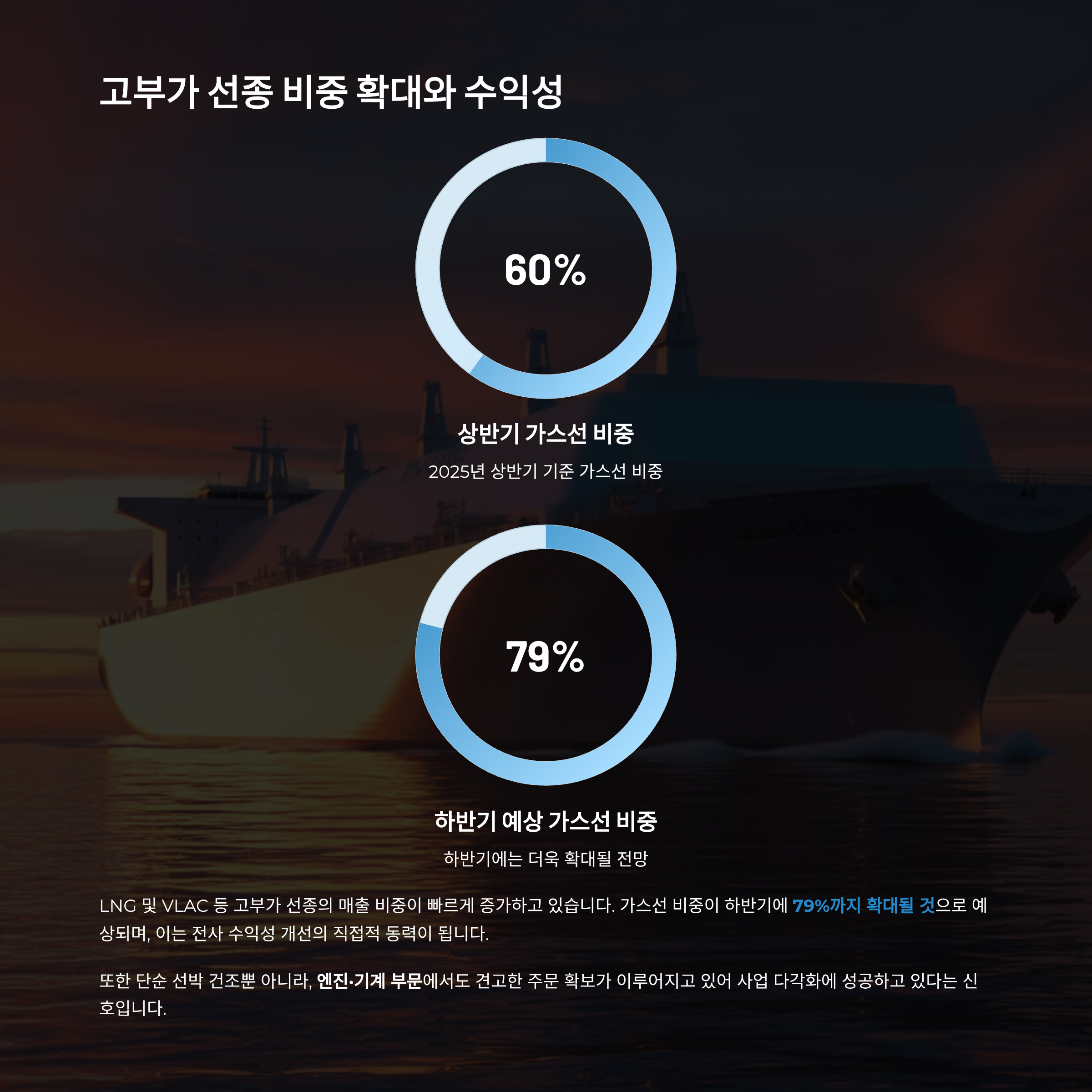 올해 상반기에는 가스선 비중이 60%였지만, 하반기에는 79%까지 확대될 것으로 보이며, 이는 전사 수익성 개선의 직접적 동력이 됩니다.