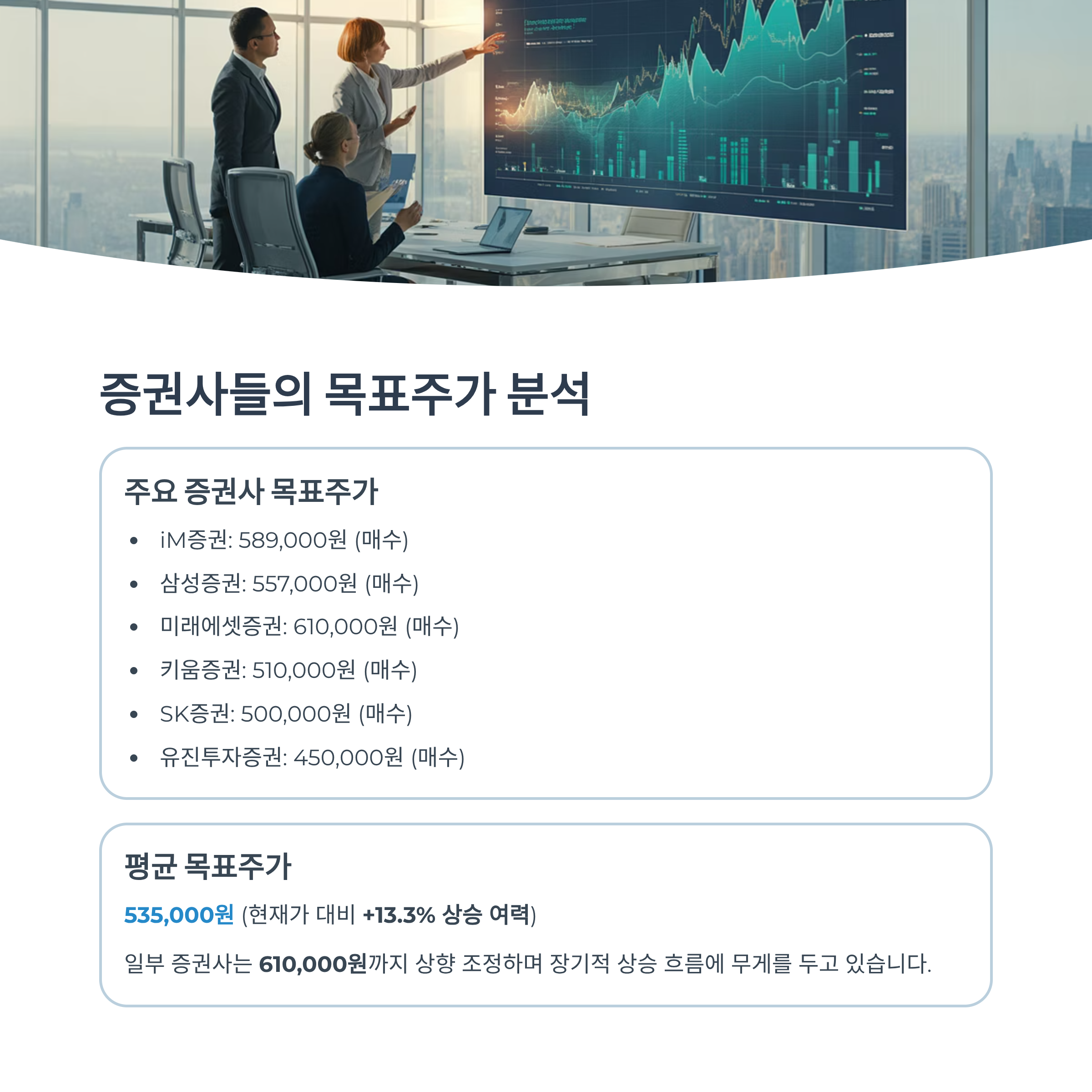 일부 증권사는 610,000원까지 상향 조정하며 장기적 상승 흐름에 무게를 두고 있습니다.