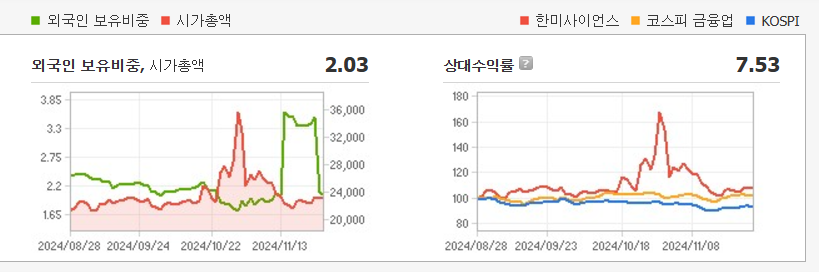 단기 포트폴리오를 구성할 때는 시가 총액과 장중 거래량도 중요합니다. 한미사이언스의 시가 총액은 2조4416억 원이며 장중 거래량은 207,534원 을 기록했습니다. 대주주의 정보는 크게 중요하지 않을 수도 있지만 장기적인 관점에서는 대주주 정보도 확인해보는 것이 좋겠습니다.