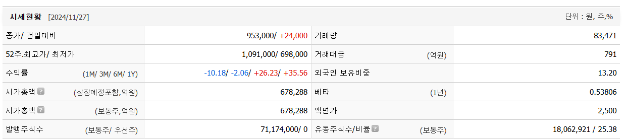 삼성바이오로직스의 현재 주가는 953,000원입니다. 전일 대비 -10.18원 이동한 모습입니다. 시가 총액은 71조1740억 원이며 발행 주식은 총 71,174,000주 입니다. 외국인이 보유한 비중은 13.20%입니다. 삼성바이오로직스 기업의 영업이익은 억 원을 달성했으며 배당 수익율은 % 입니다.