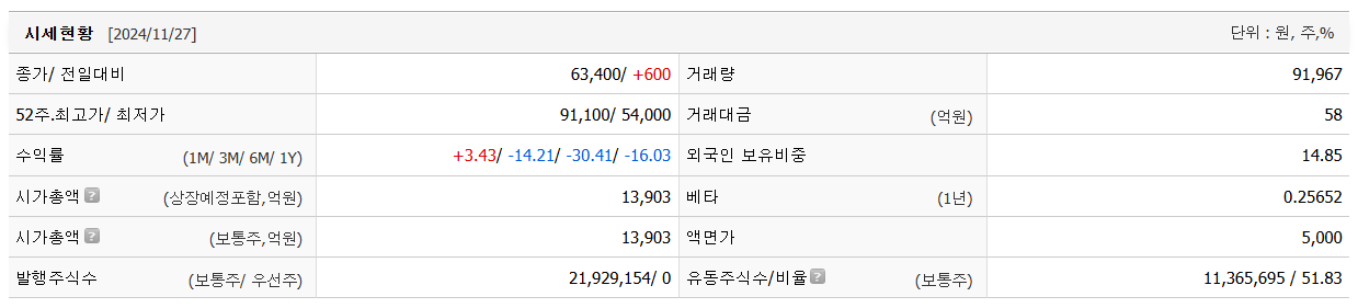 CJ ENM의 현재 주가는 63,400원입니다. 전일 대비 -14.21원 이동한 모습입니다. 시가 총액은 1조4254억 원이며 발행 주식은 총 21,929,154주 입니다. 외국인이 보유한 비중은 14.85%입니다. CJ ENM 기업의 영업이익은 억 원을 달성했으며 배당 수익율은 % 입니다.