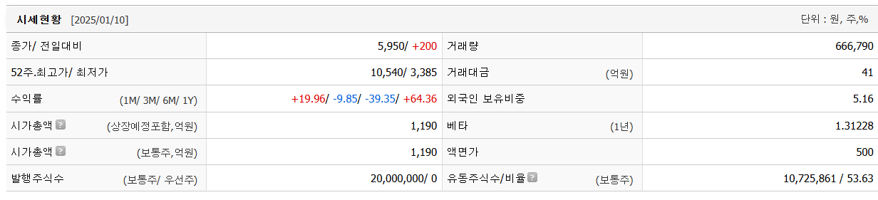 제룡산업의 현재 주가는 5,950원입니다. 전일 대비 -9.85원 이동한 모습입니다. 시가 총액은 1546억 원이며 발행 주식은 총 20,000,000주 입니다. 외국인이 보유한 비중은 5.16%입니다. 제룡산업 기업의 영업이익은 억 원을 달성했으며 배당 수익율은 % 입니다.