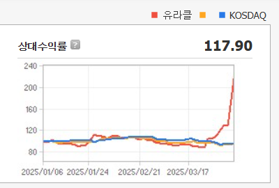 2024년 하반기까지만 해도 유라클의 주가는 공모가 대비 절반 이하로 하락하며 다소 부진한 흐름을 보였습니다. 하지만 2025년 3월부터는 분위기가 완전히 달라졌습니다. 한 달 동안 28%라는 높은 주가 상승률을 기록했으며, 일 거래량도 220만 주 이상을 넘기며 투자자들의 관심이 쏠렸습니다.